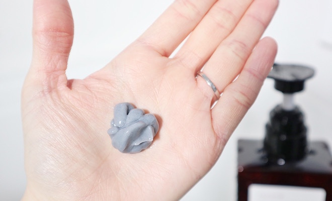 ポンプ式のシャンプーで、押すとクレイ配合らしくグレーのクリームが出てきます。