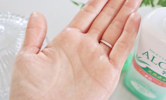 - ハーブスキンミルキーローションを適量手のひらに取り、お肌になじませる