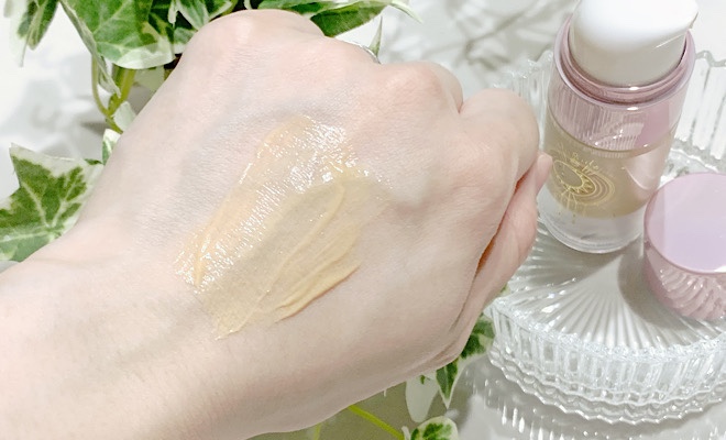 手の甲に出してみると、まるでファンデーションのようなベージュのベース。