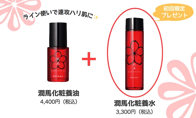 潤馬化粧養油を定期購入すると安く買えるだけでなく、初回注文は現品サイズの潤馬化粧養水もプレゼントで届きます。