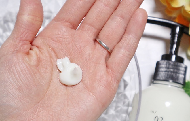 続いてクリーム色のリペアは、液だれするほどのゆるさはありませんが、髪に伸ばすとスルスルとなじんでいきます。