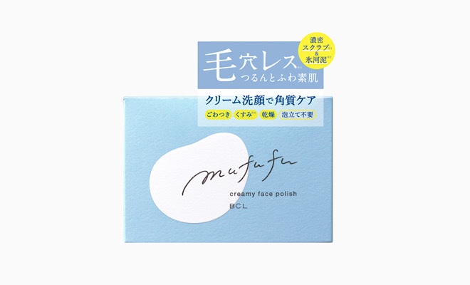 ムフフのクリーミーフェイスポリッシュは洗顔後のつっぱり感が気にならず、お肌のザラつきが改善されると好評!
