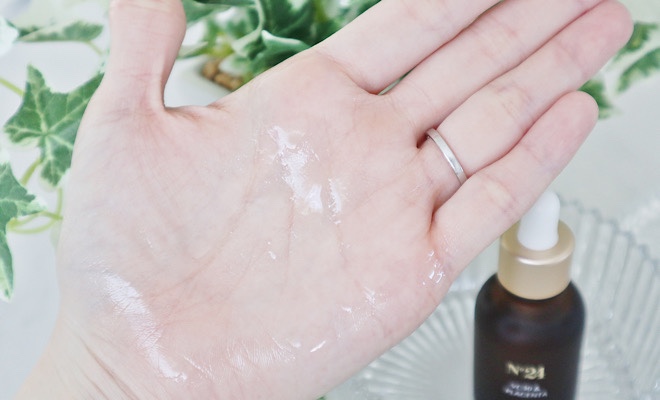 No.24のC30セラムは透明な美容液で、手のひらに美容液を出した時は水のように弾く感覚がありますが、伸ばすとオイルのようにしっとりお肌になじんでいきます。