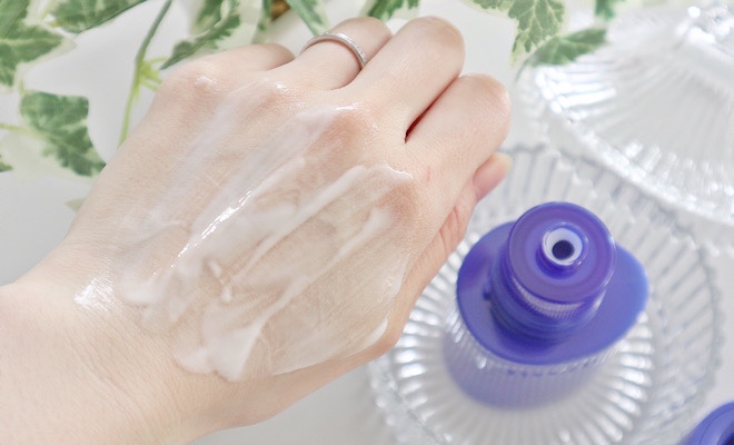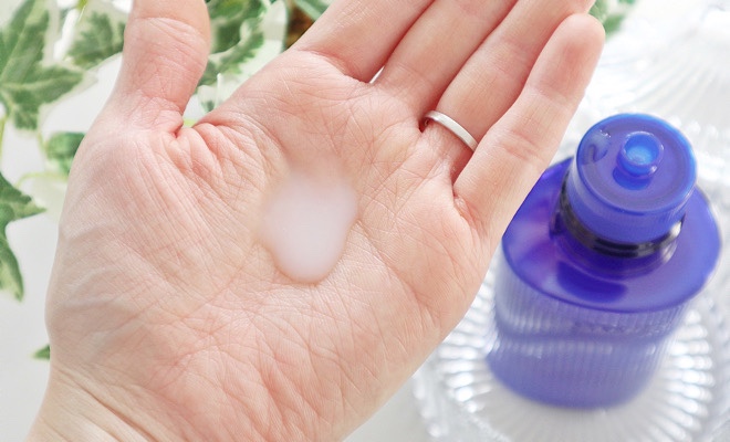 化粧水を取り出してみると、白くて少しとろみのあるテクスチャーをしています。
