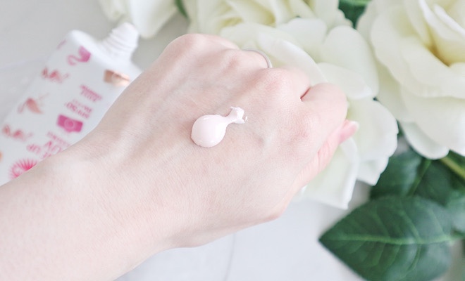 チューブを押してみると淡いピンク色のエッセンスクリームで、日焼け止めというよりもまるで化粧下地のようです。